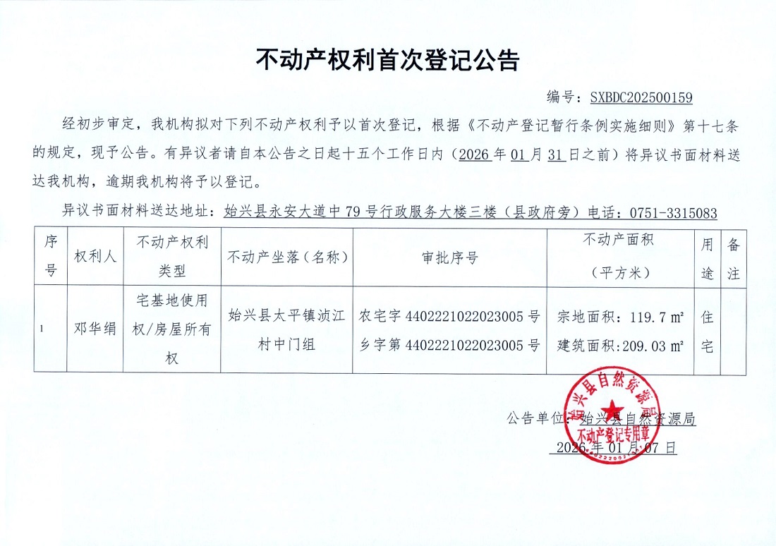 不动产权利首次登记公告(邓华娟)