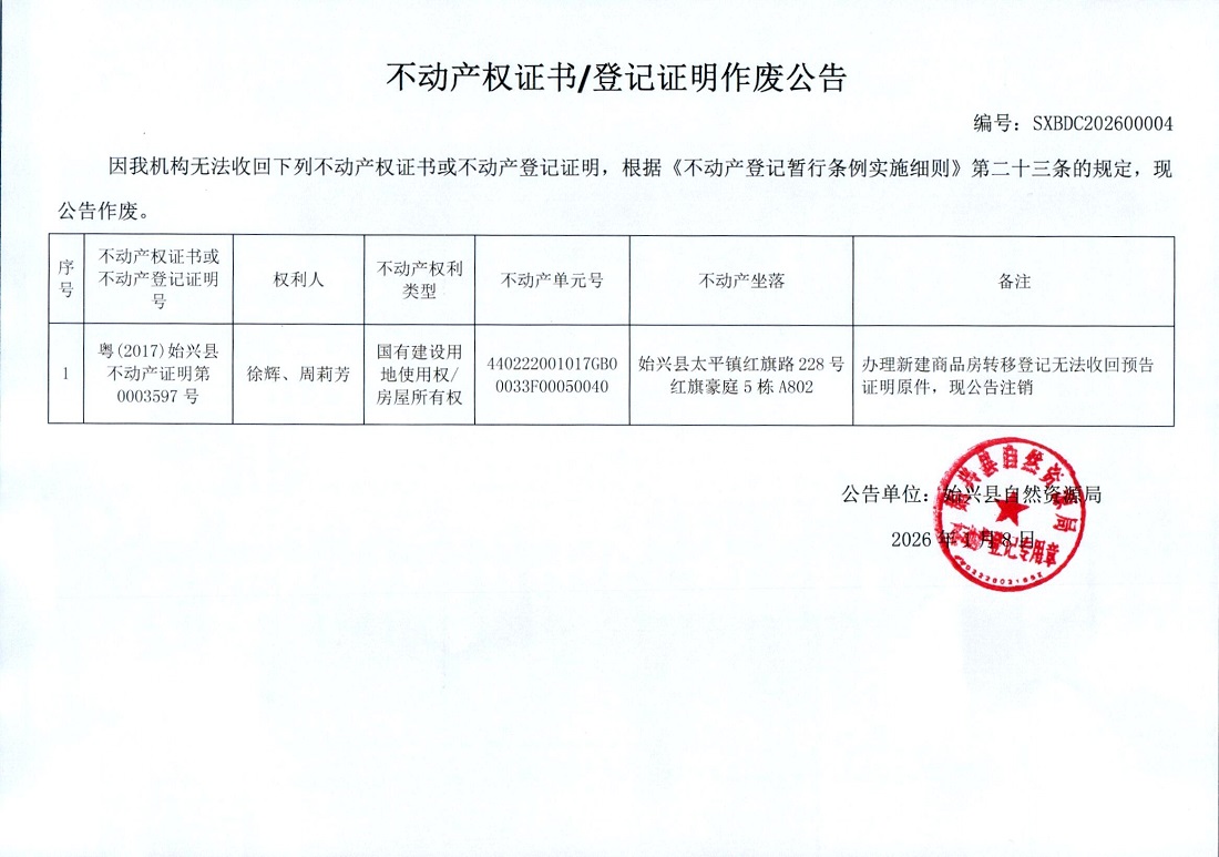 不动产权证书/登记证明作废公告(徐辉、周莉芳)