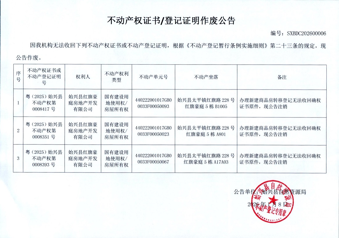 不动产权证书/登记证明作废公告(始兴县红旗豪庭房地产开发有限公司)