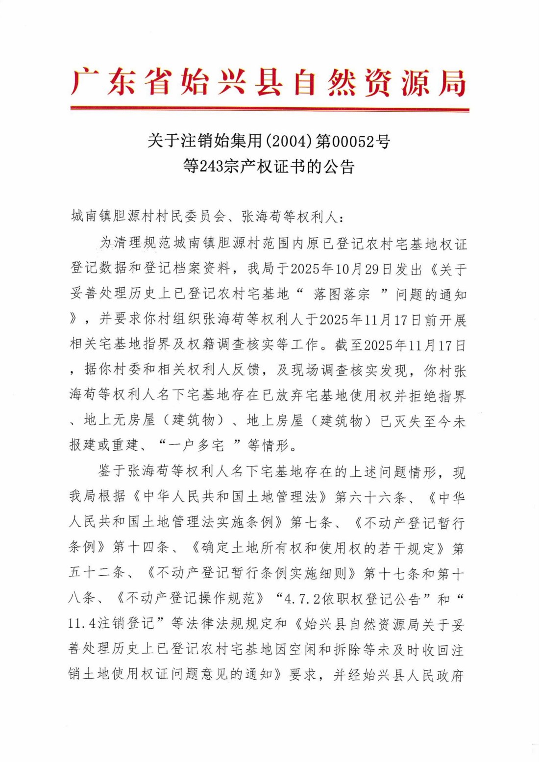 关于注销始集用(2004)第00052号等243宗产权证书的公告