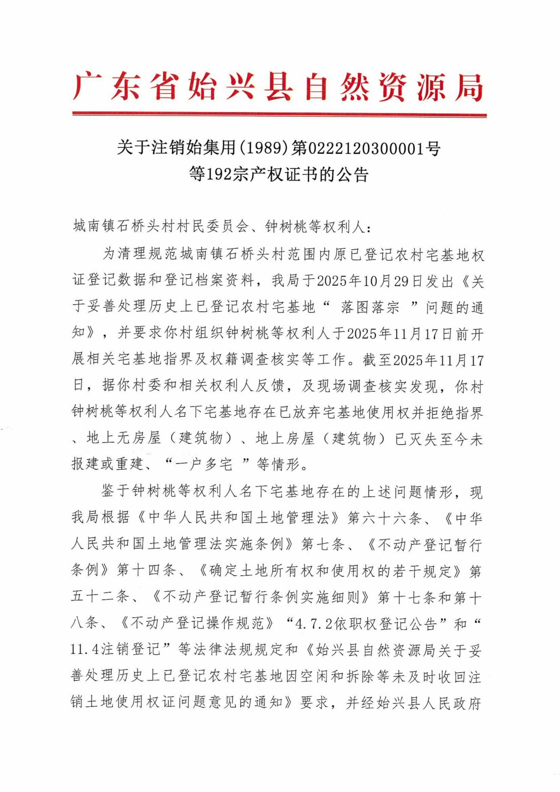 关于注销始集用(1989)第0222120300001号等192宗产权证书的公告