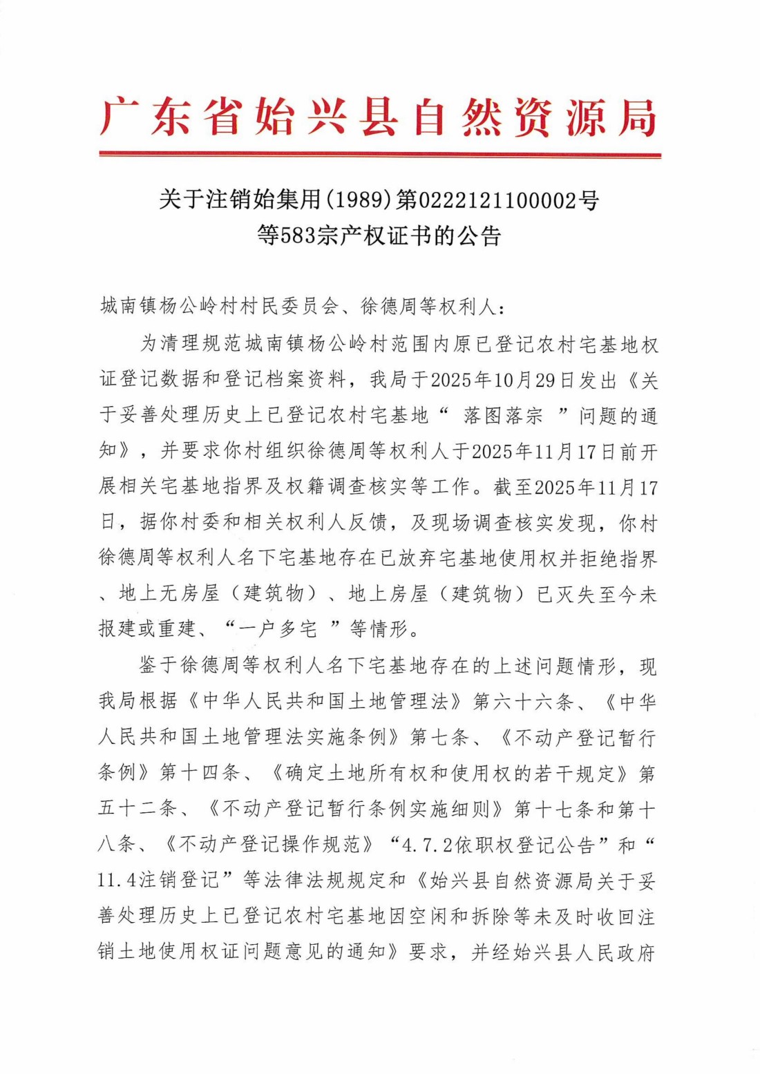关于注销始集用(1989)第0222121100002号等583宗产权证书的公告