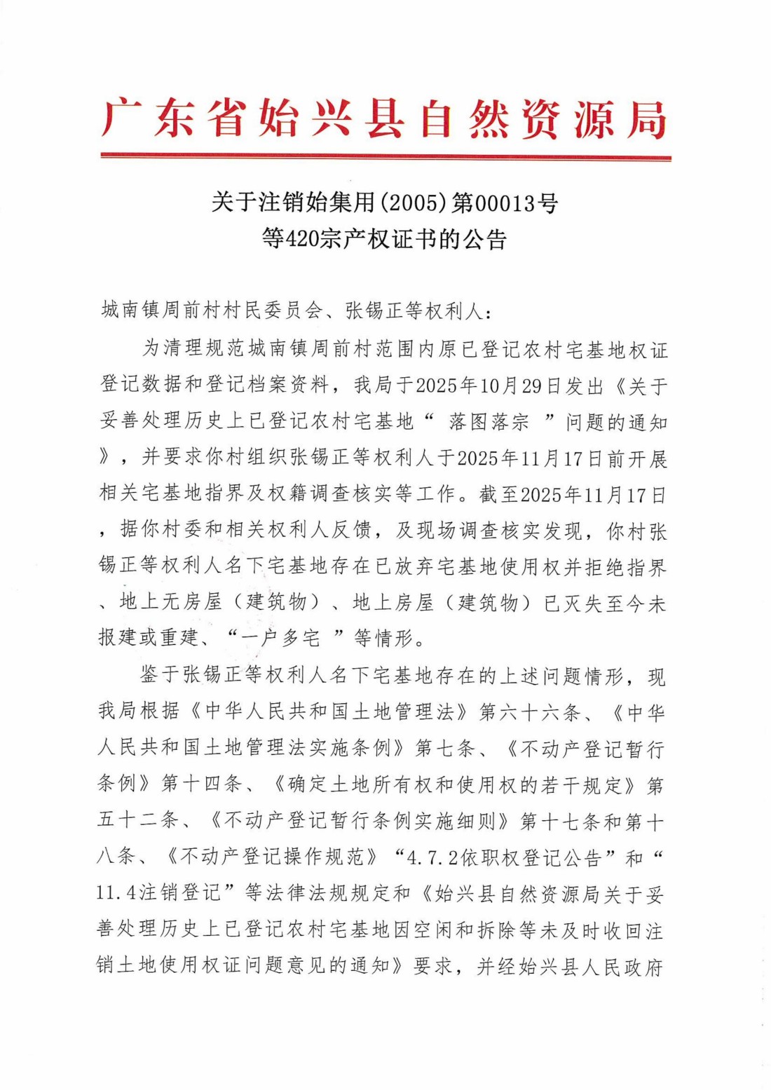 关于注销始集用(2005)第00013号等420宗产权证书的公告