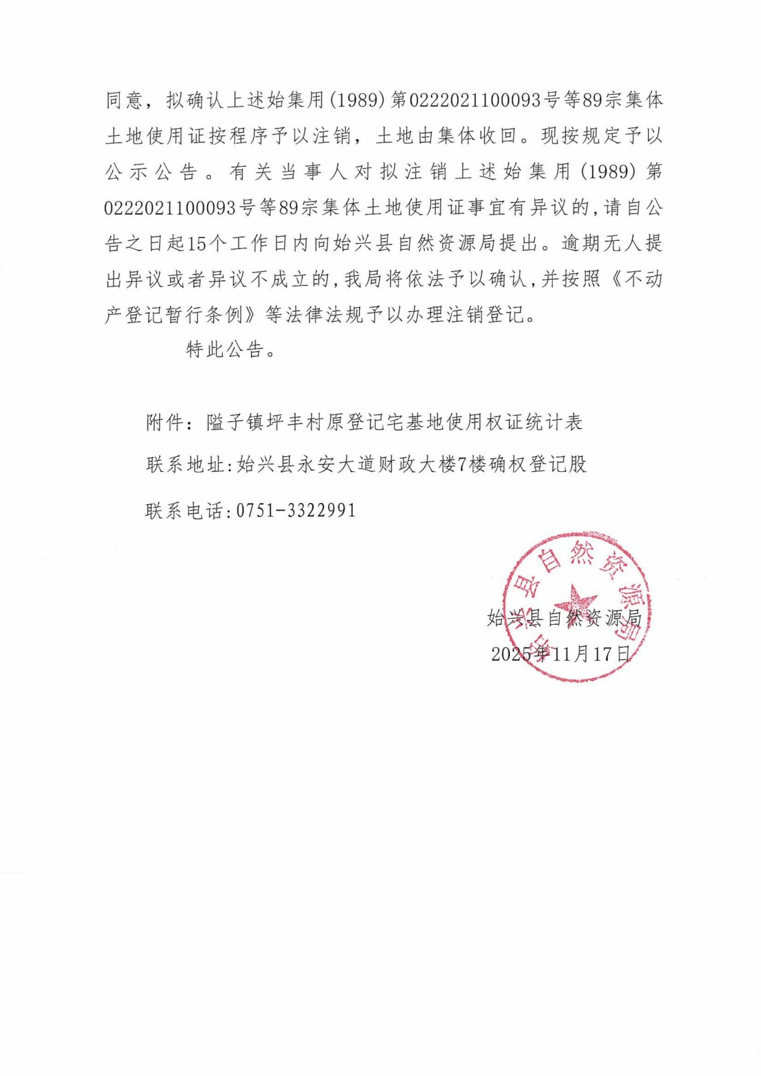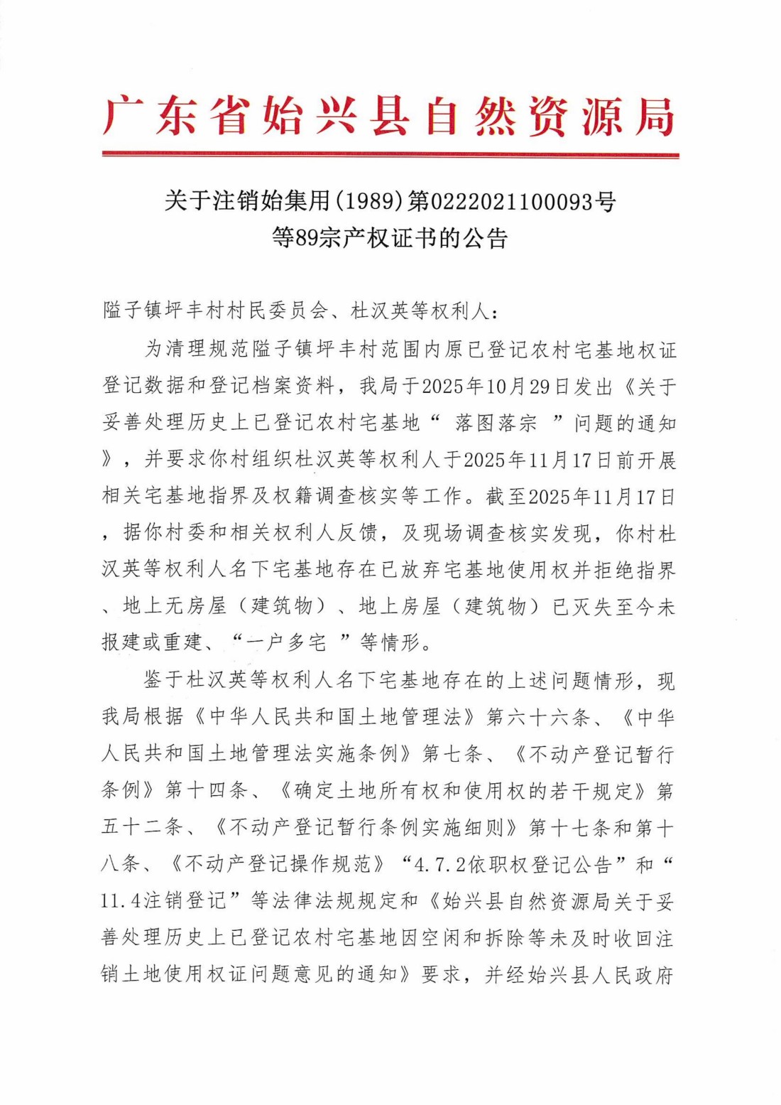 关于注销始集用(1989)第0222021100093号等89宗产权证书的公告