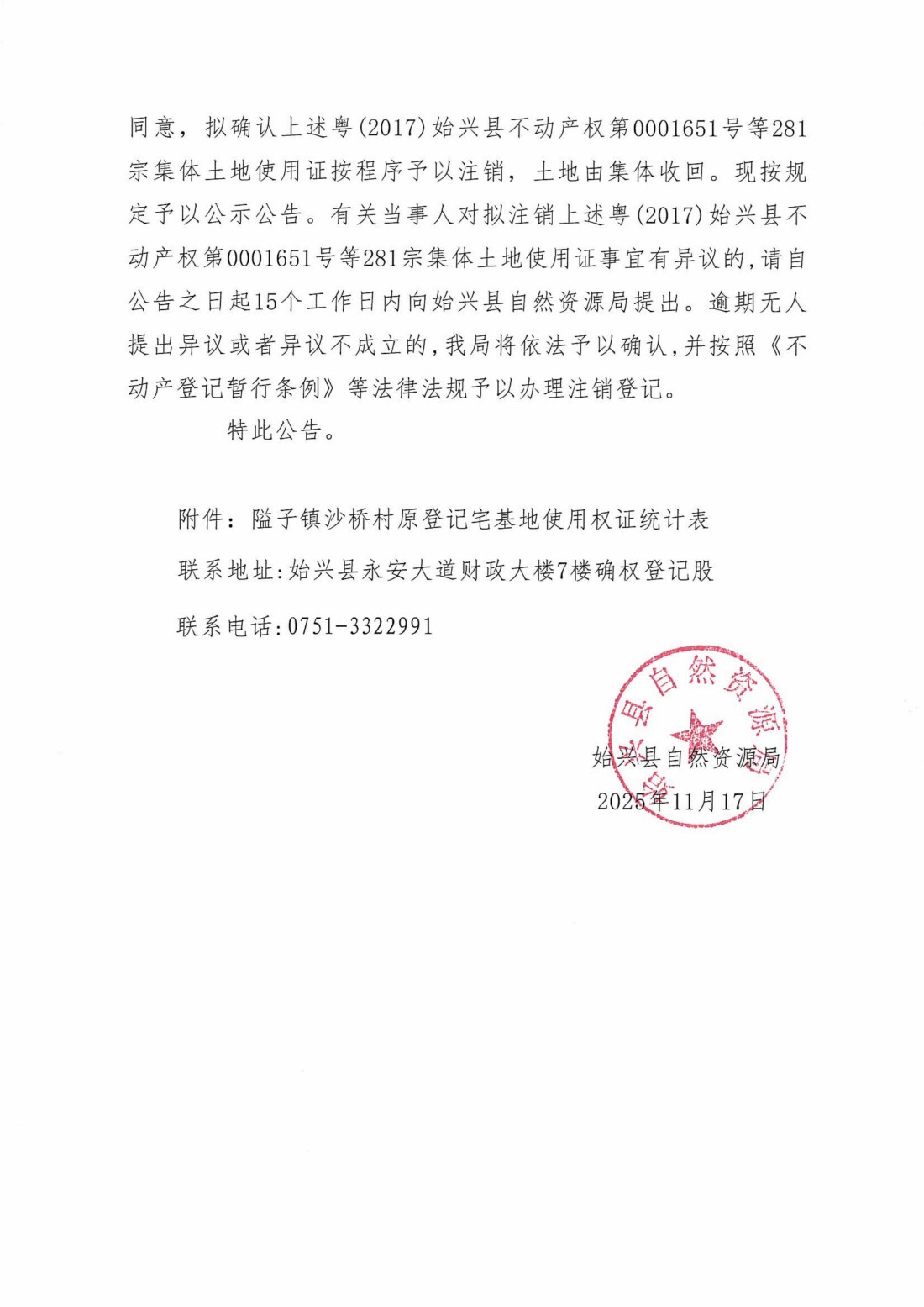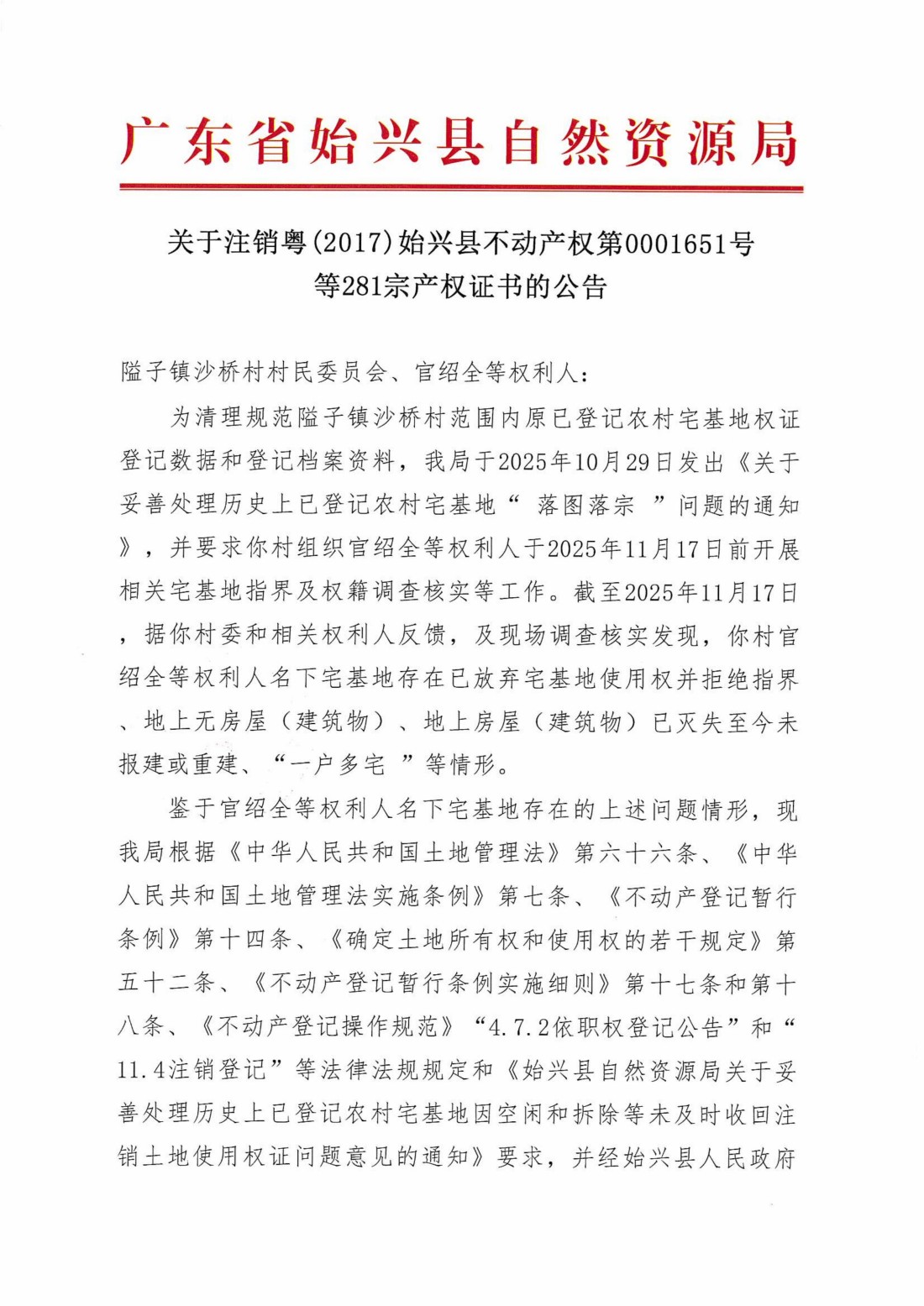关于注销粤(2017)始兴县不动产权第0001651号等281宗产权证书的公告