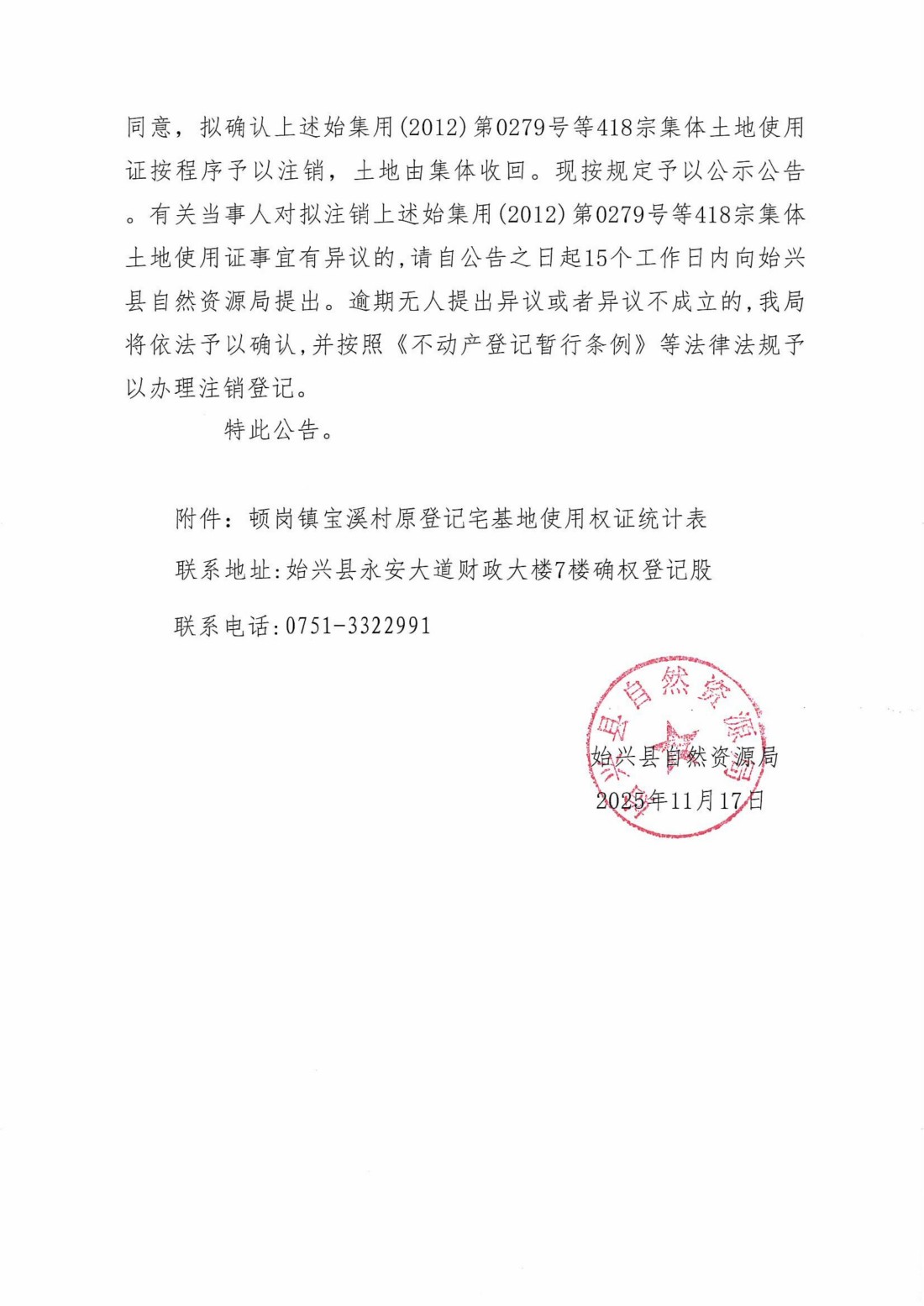 关于注销始集用(2012)第0279号等418宗产权证书的公告