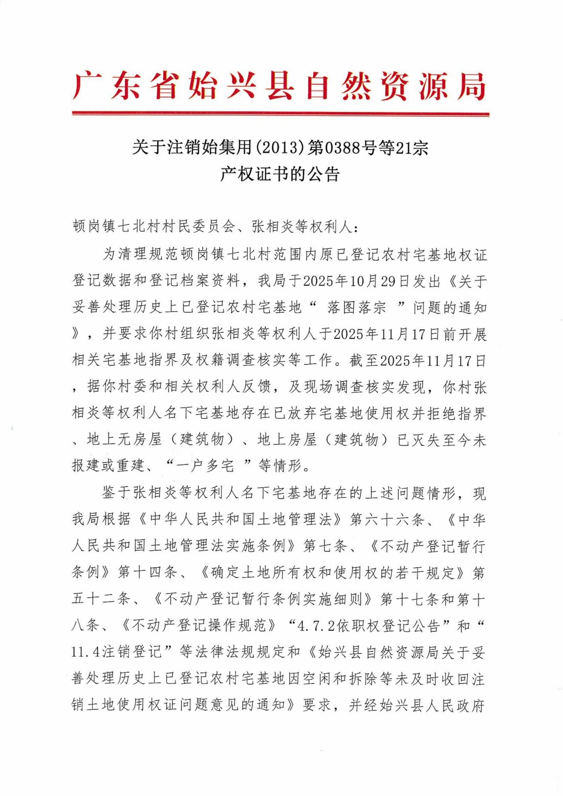 关于注销始集用(2013)第0388号等21宗产权证书的公告