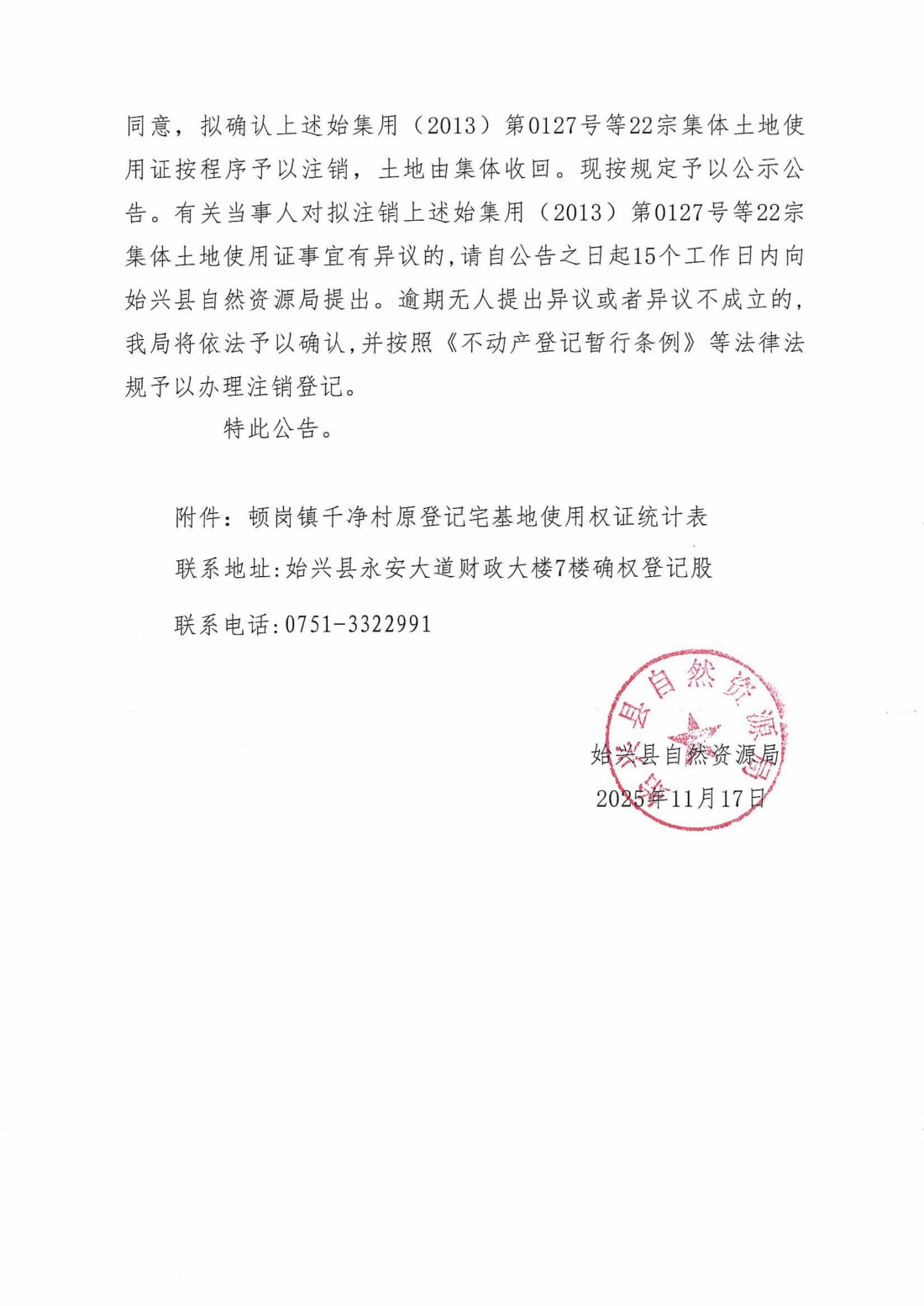 关于注销始集用(2013)第0127号等22宗产权证书的公告