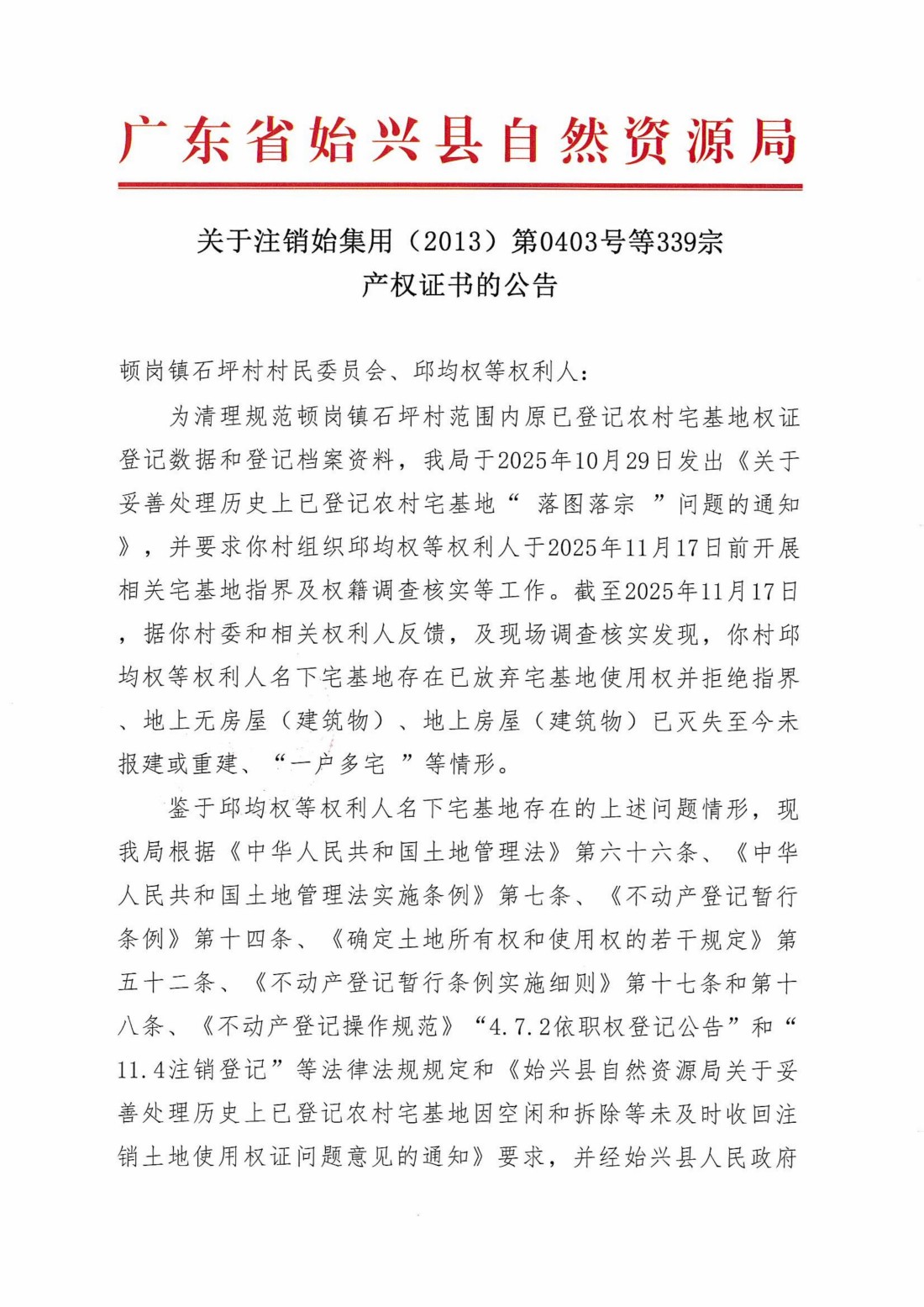 关于注销始集用(2013)第0403号等339宗产权证书的公告