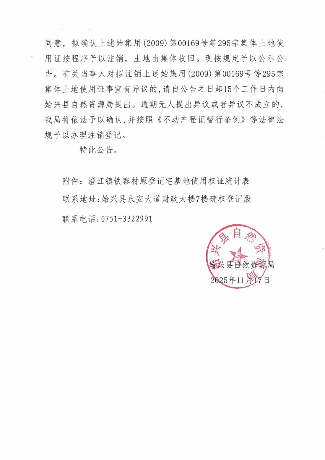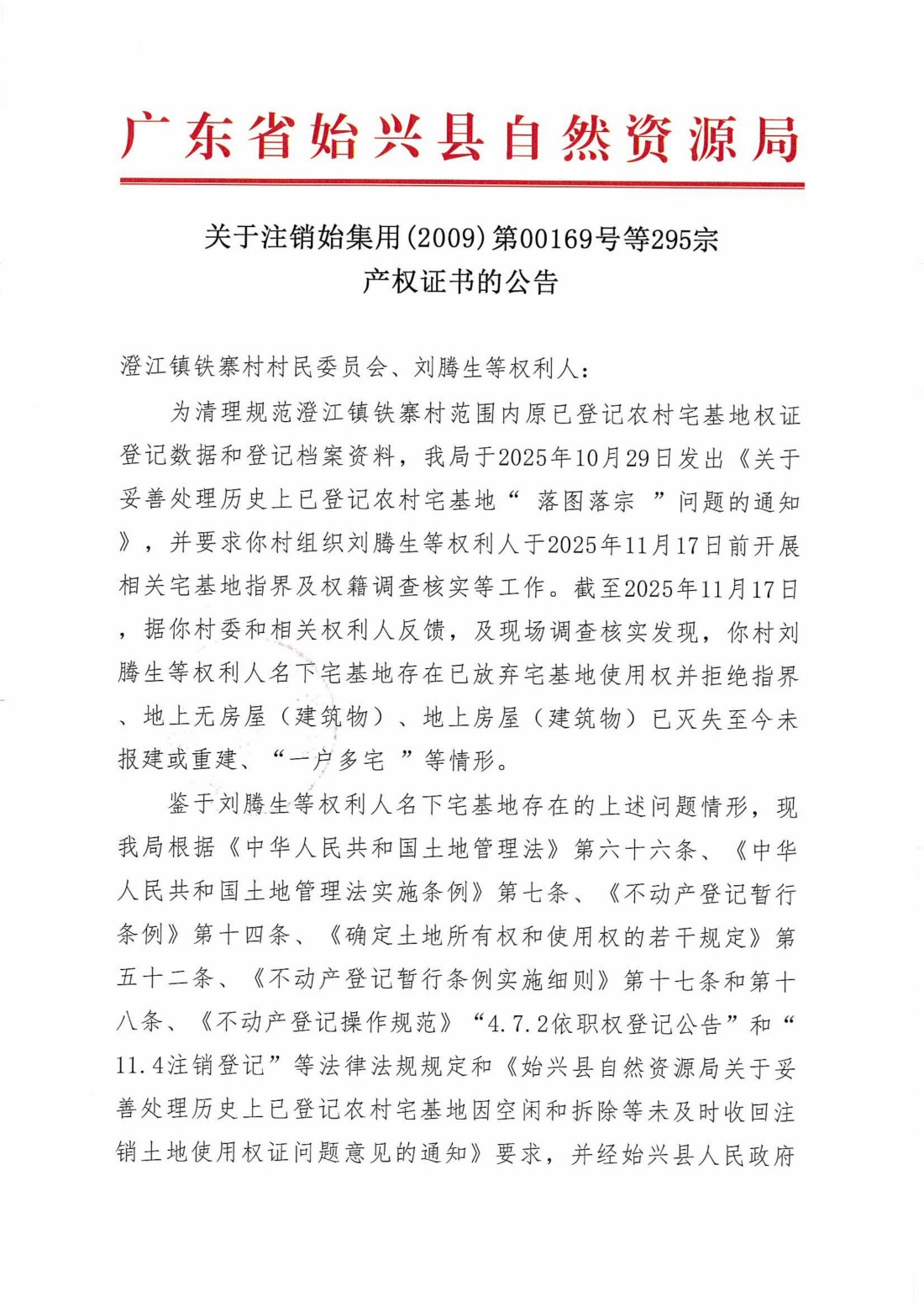 关于注销始集用(2009)第00169号等295宗产权证书的公告