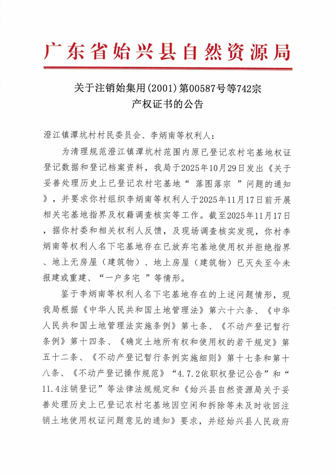 关于注销始集用(2001)第00587号等742宗产权证书的公告