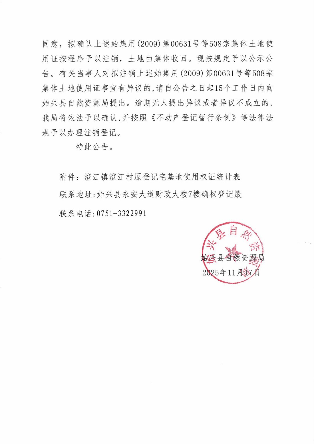 关于注销始集用(2009)第00631号等508宗产权证书的公告