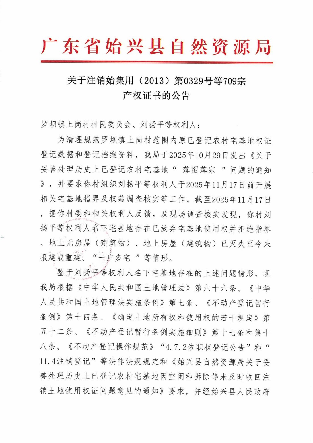 关于注销始集用(2013)第0329号等709宗产权证书的公告