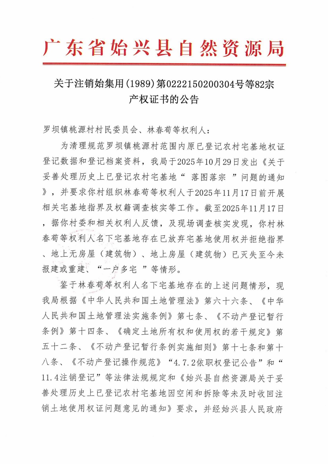 关于注销始集用(1989)第0222150200304号等82宗产权证书的公告