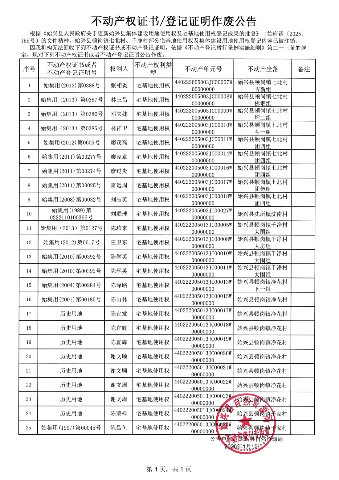 不动产权证书/登记证明作废公告(顿岗镇七北村、千净村)