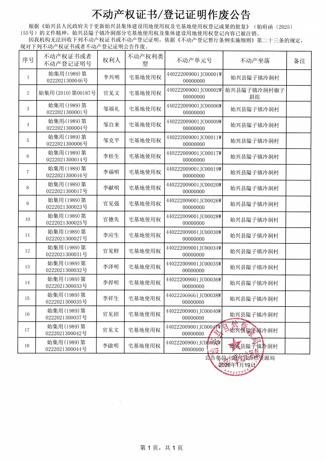 不动产权证书/登记证明作废公告(隘子镇冷洞村)
