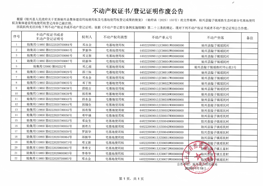 不动产权证书/登记证明作废公告(隘子镇瑶族生态村)