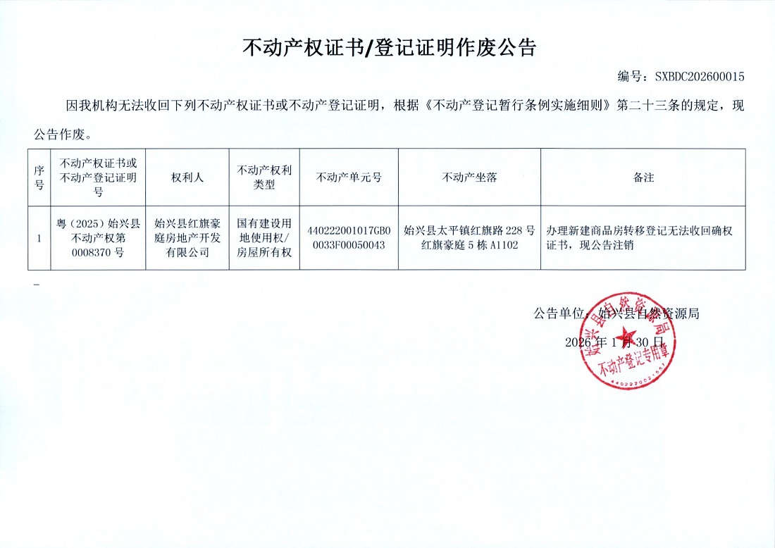 不动产权证书/登记证明作废公告(始兴县红旗豪庭房地产开发有限公司)