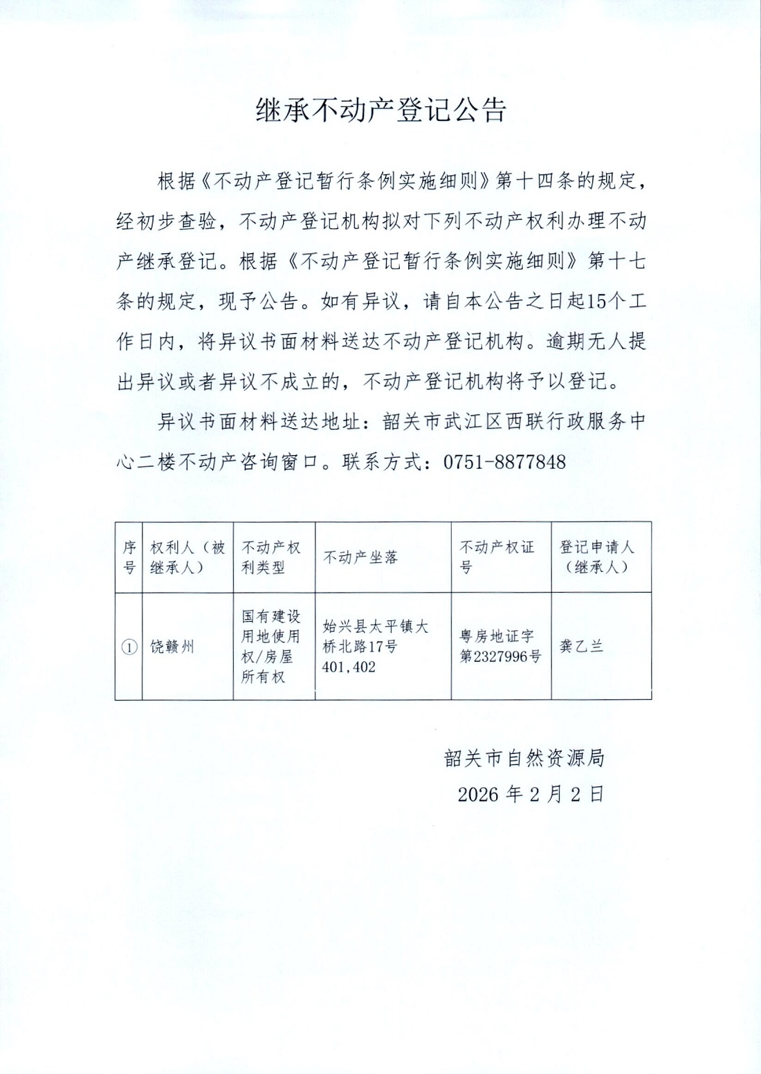 继承不动产登记公告