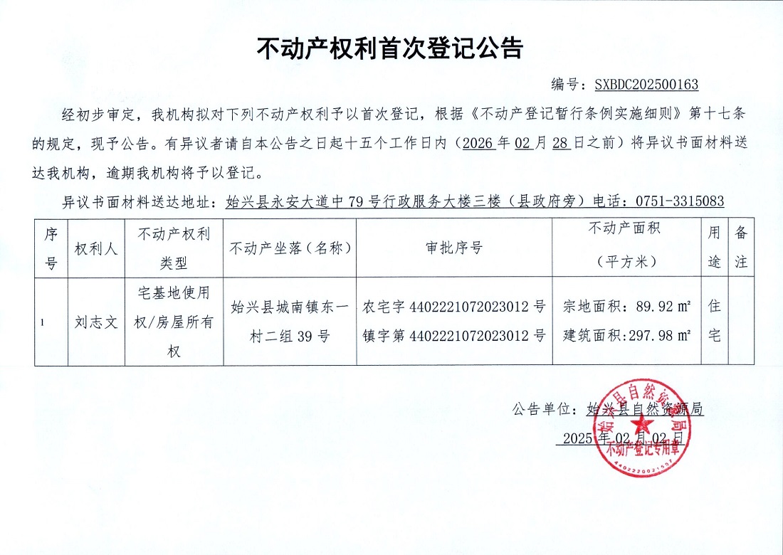 不产权利首次登记公告(刘志文)