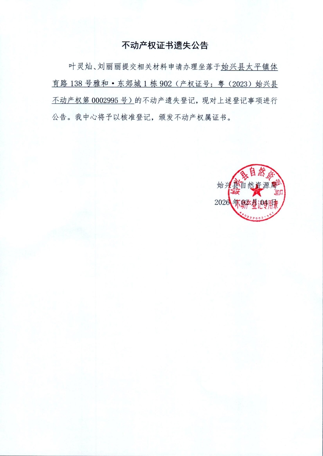 不动产权证书遗失公告