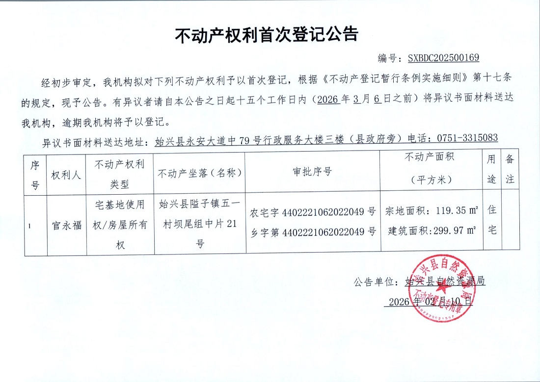 不产权利首次登记公告(官永福)