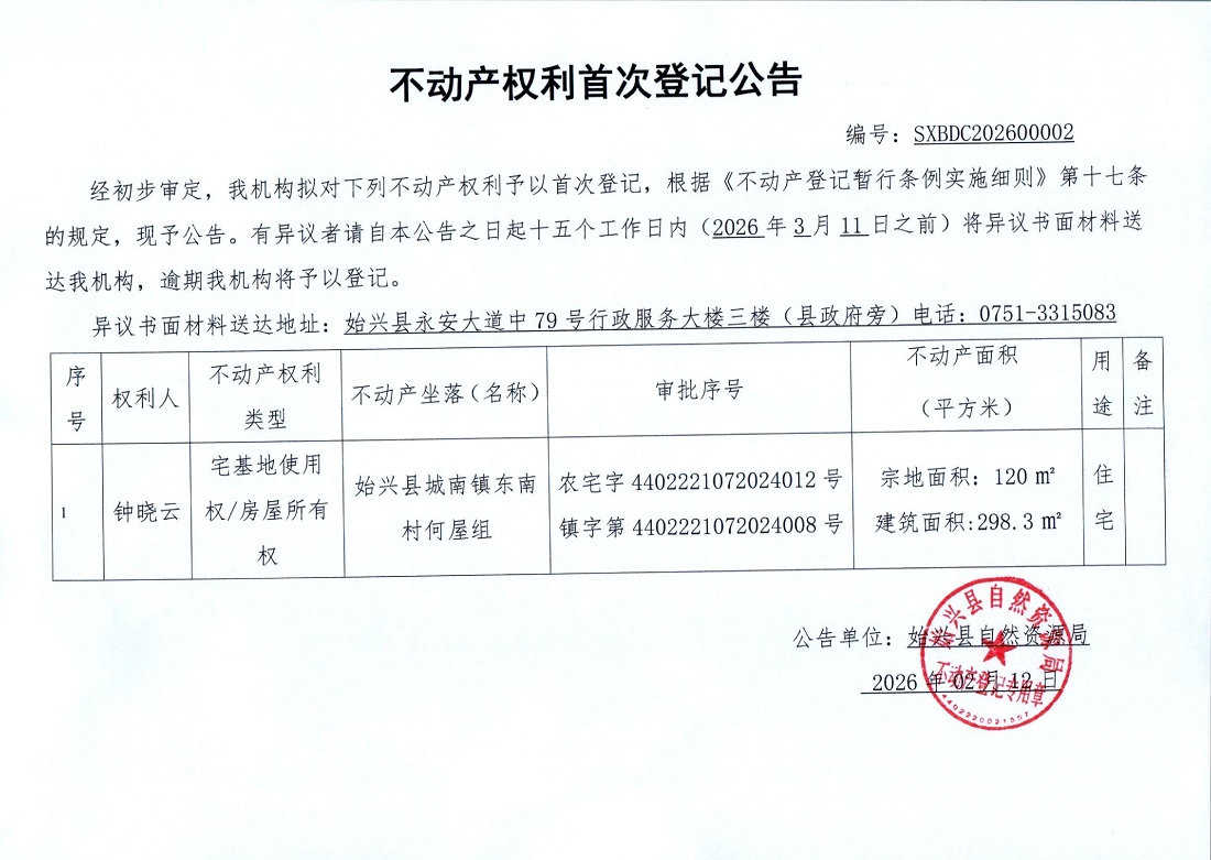 不产权利首次登记公告(钟晓云)