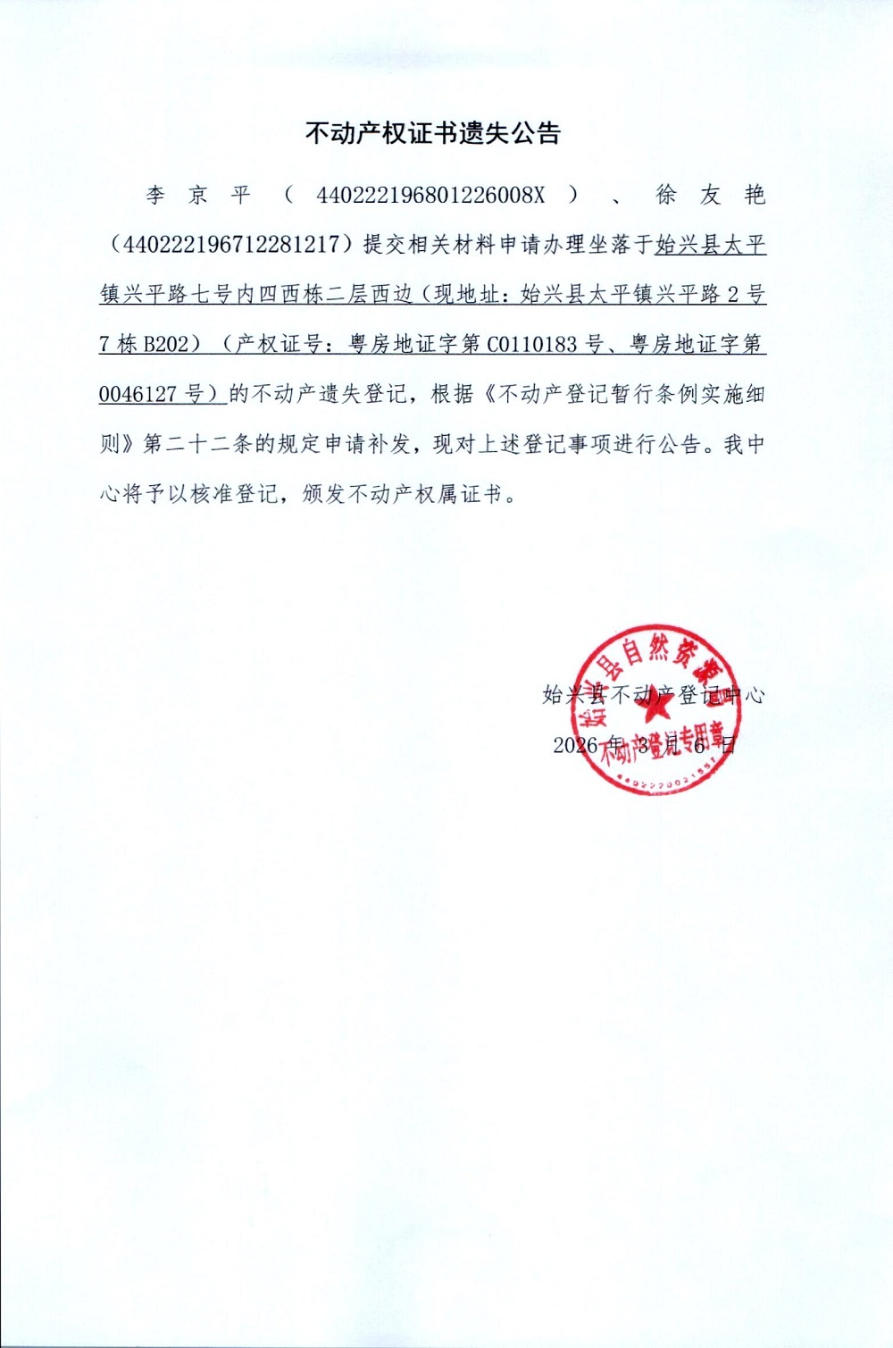 不动产权证书遗失公告