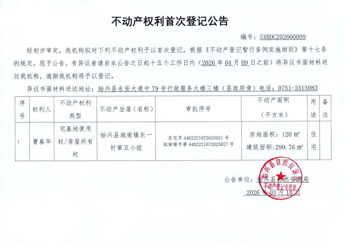 不产权利首次登记公告(曹春华)