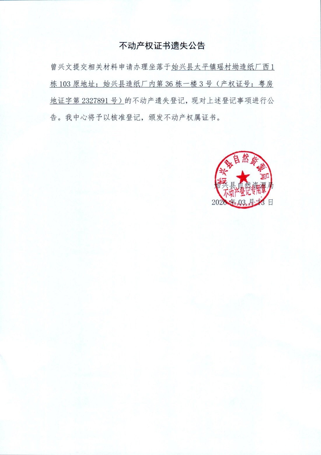 不动产权证书遗失公告(曾兴文)