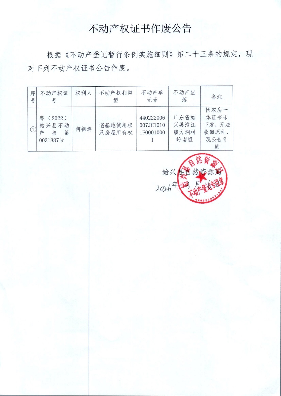 不动产权证书遗失公告(何祖连)