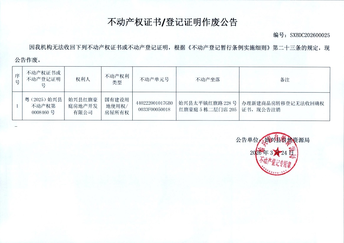 不动产权证书/登记证明作废公告(始兴县红旗豪庭房地产开发有限公司)